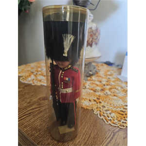 Vintage British Royal Guard souvenir doll featuring the classic red uniform and tall black bearskin-style hat. The figure holds a rifle and wears traditional ceremonial guard attire inspired by the gu read more...